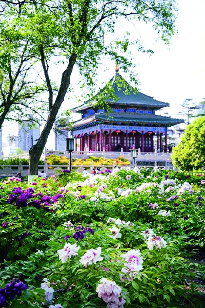 今天我们看到的沉香亭是1958年依据唐代史料在原址复建而成,现为兴庆宫公园的核心景观。在沉香亭的旁边有一座彩云楼是1987年修建的,楼下有一座雪花石雕琢的“李白醉卧长安”雕像,线条粗犷大气,形态自然,生动再现了李白醉后的神态。基座上刻有杜甫所作的《饮中八仙歌》:“李白斗酒诗百篇,长安市上酒家眠。天子呼来不上船,自称臣是酒中仙”。建筑与诗结合得如此完美,充满了浓郁的文化韵味,给人以无限遐思。