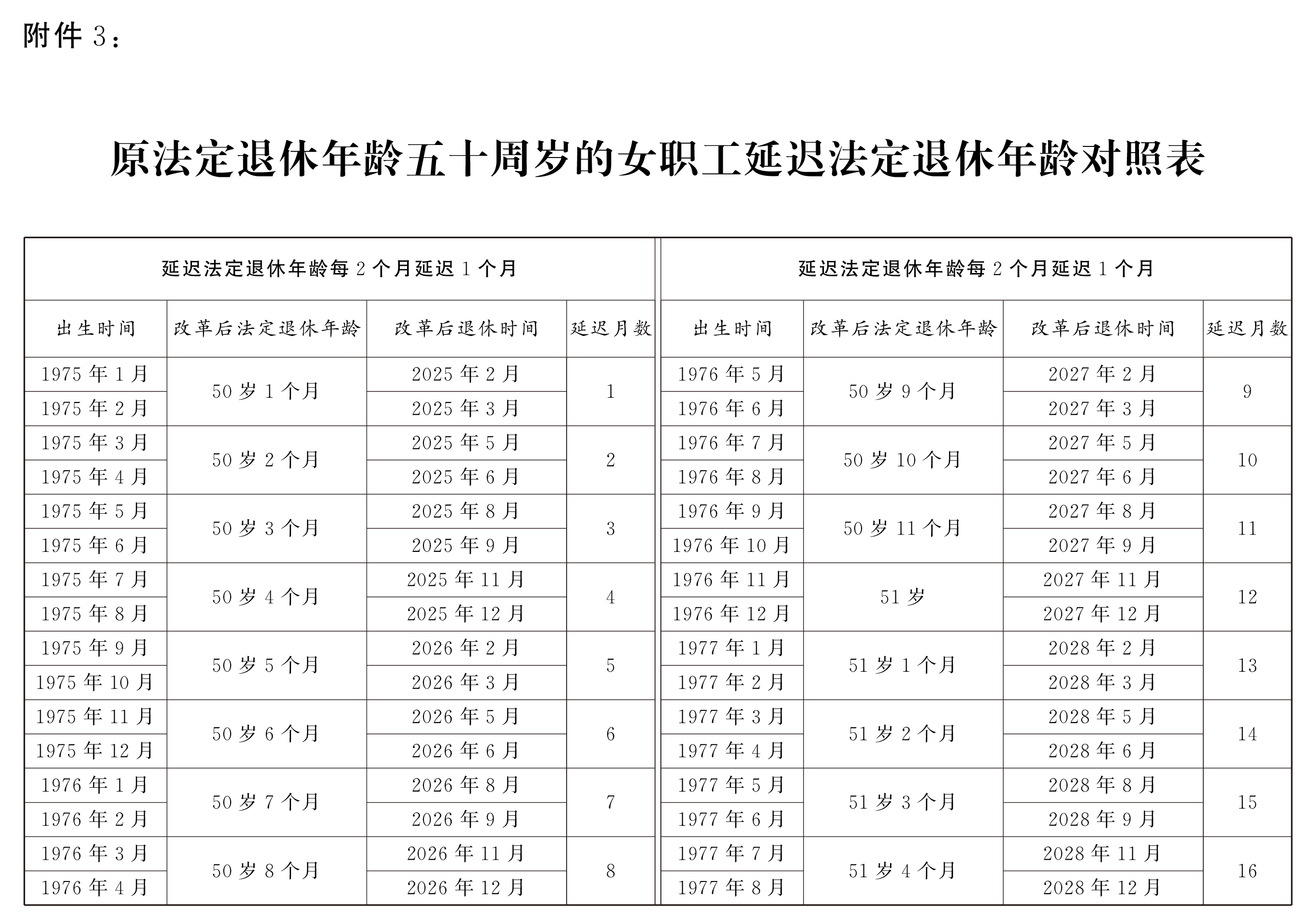 3.原法定退休年龄五十周岁的女职工延迟法定退休年龄对照表