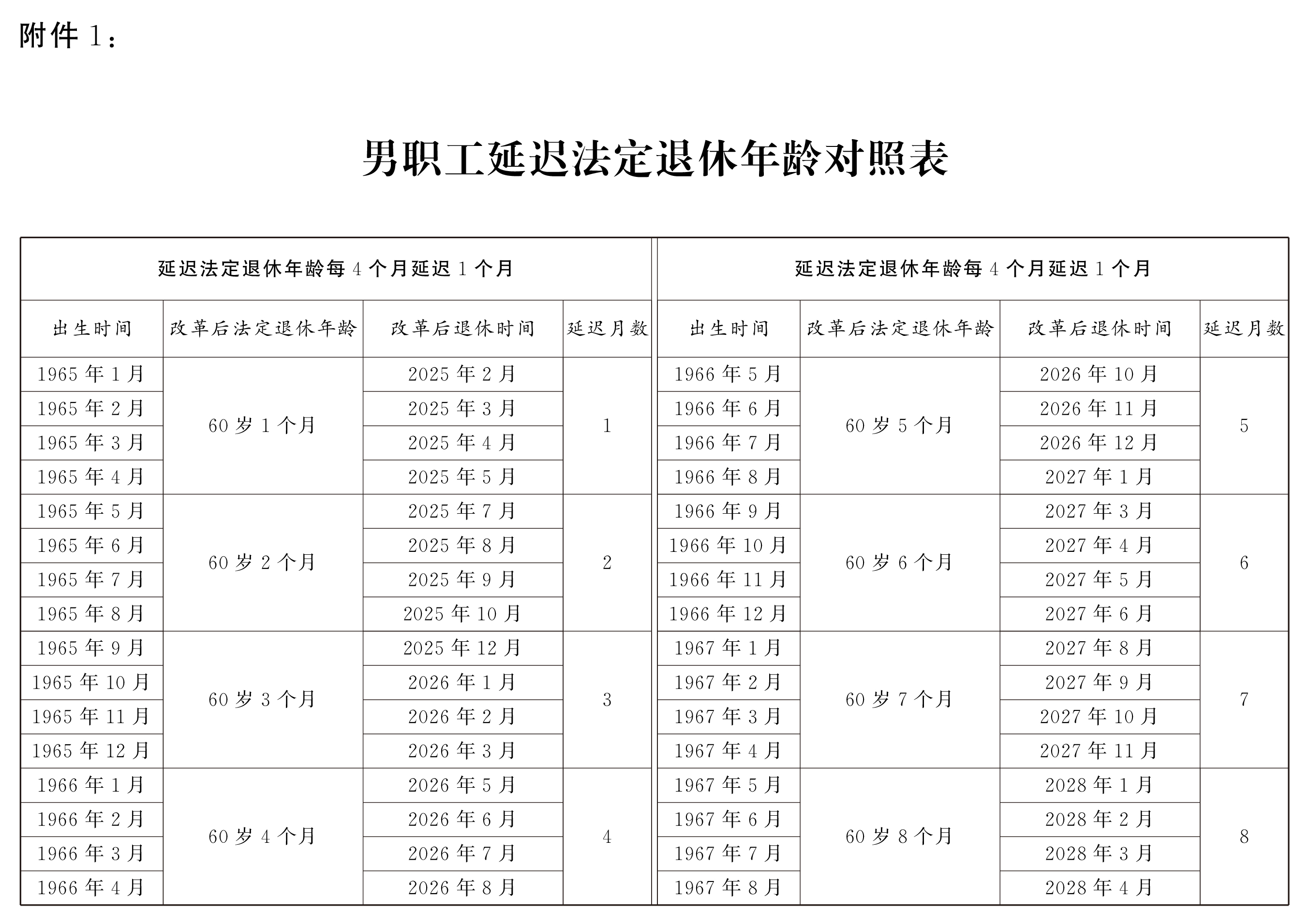 1.男职工延迟法定退休年龄对照表