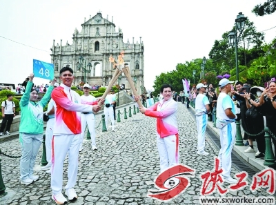 11月2日,火炬手陈虹(前右)、罗协铭在传递活动中交接圣火。当日,中华人民共和国第十五届运动会火炬传递澳门站举行。新华社发(张金加 摄)