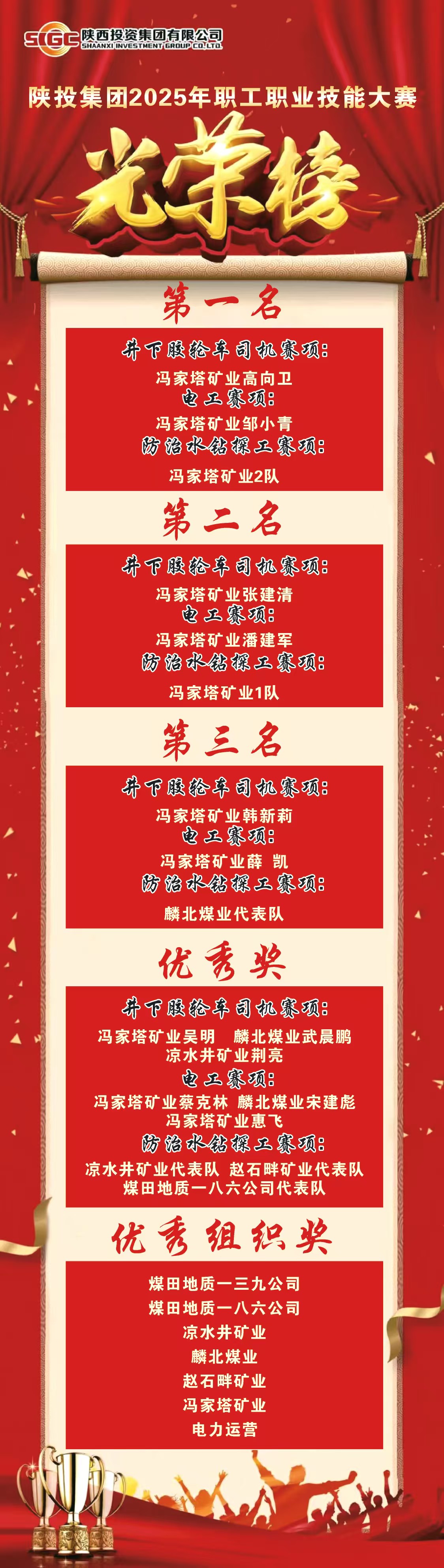 本次大赛为期3天,吸引7支代表队共64名选手参赛。经角逐,高向卫、邹小青、冯家塔矿业2队分别斩获井下胶轮车司机、电工、防治水钻探工赛项第一名,其中井下胶轮车司机赛项第一名获推荐申报“陕西省技术能手”;张建清、潘建军、冯家塔矿业1队分获各赛项第二名;韩新莉、薛凯、麟北煤业代表队分获各赛项第三名;各赛项4至6名选手获“优秀奖”。煤田地质一三九公司、煤田地质一八六公司、凉水井矿业、麟北煤业、赵石畔矿业、冯家塔矿业、电力运营公司分获“优秀组织奖”。(解张建)