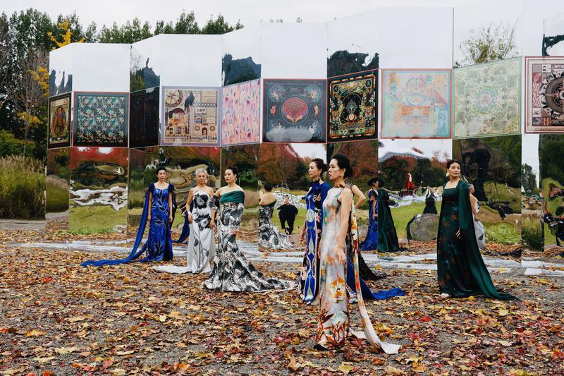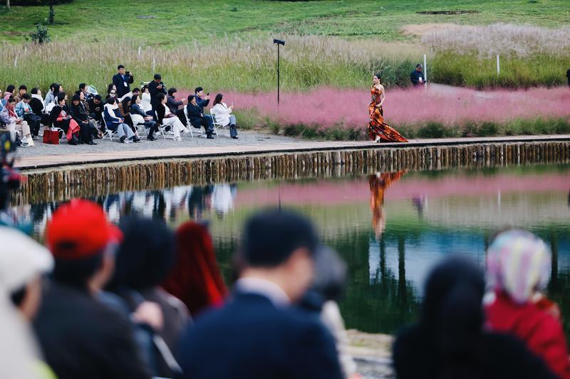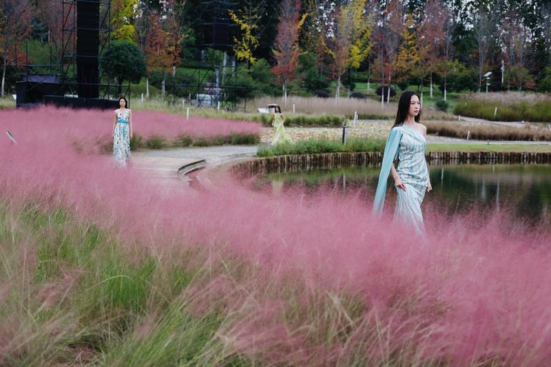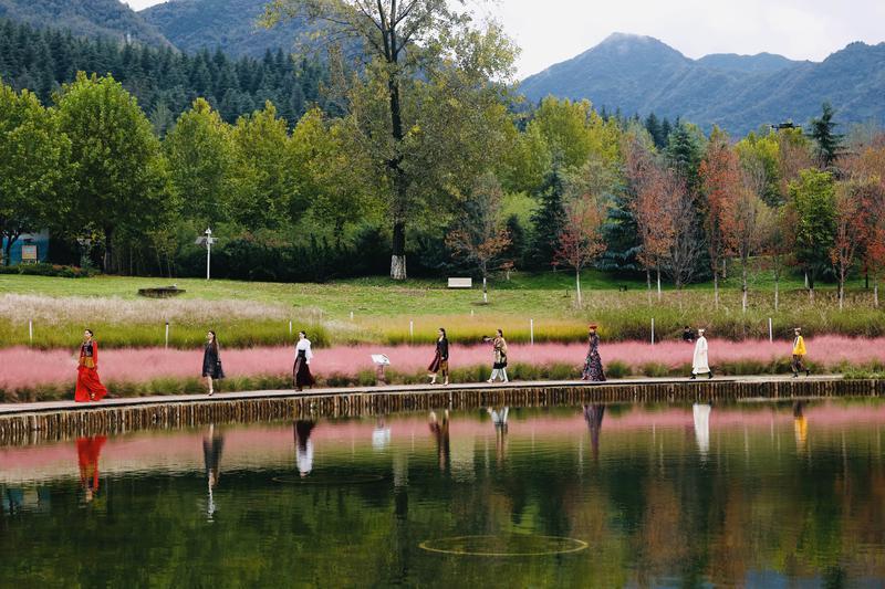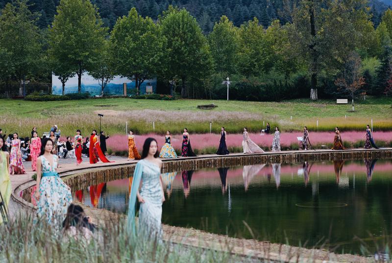 当身穿华衣的模特们翩然行走在太极湖畔,将秦岭的山峦流水、万物生灵绘入丝绸霓裳之中,从“镜面”款款走出,宛如流动的“生态使者”,连接人文、艺术与自然的诗意纽带,引发现场观众惊叹。