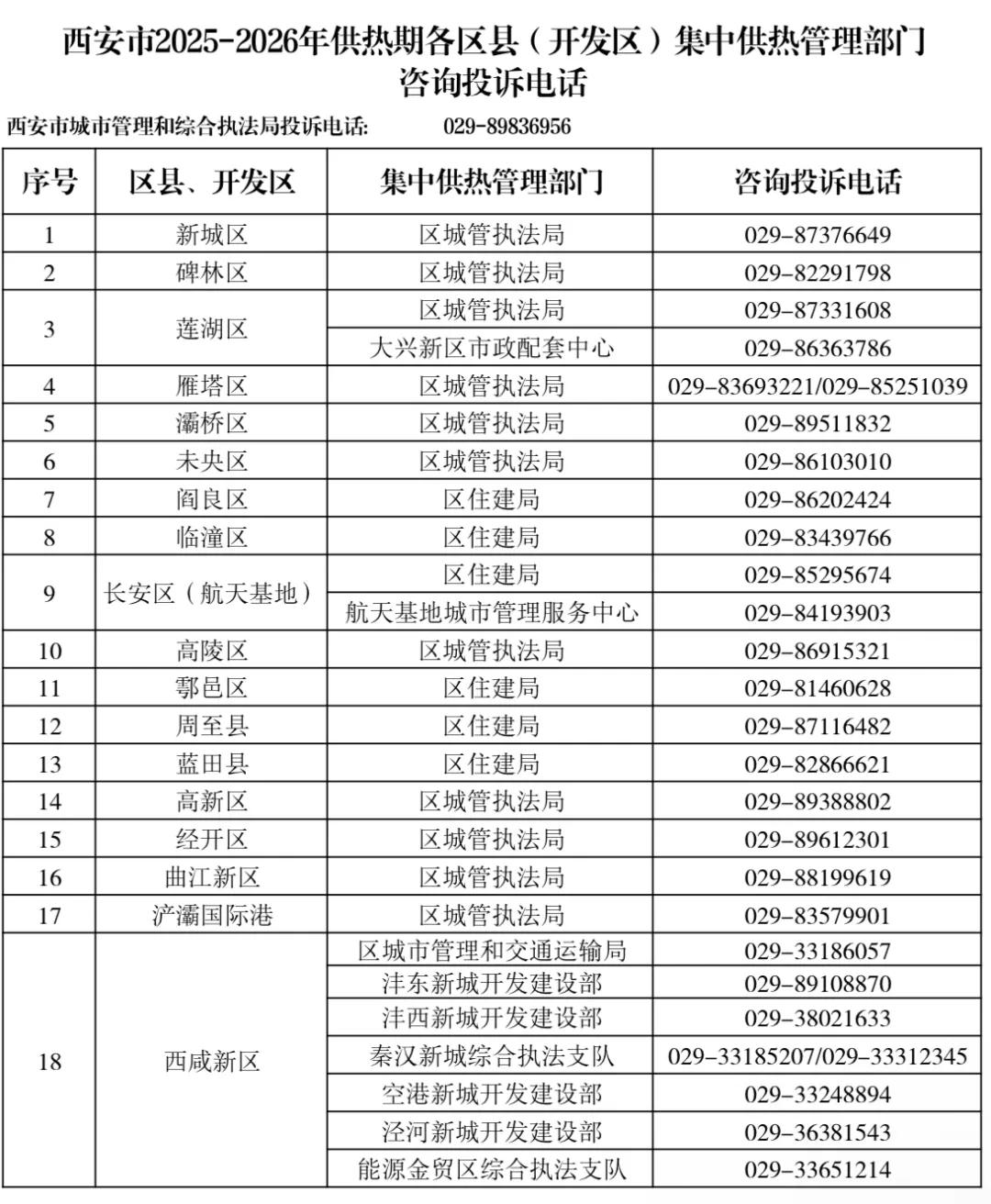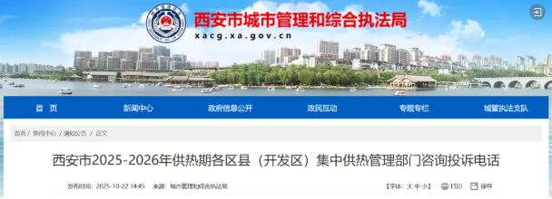 10月22日西安市城市管理和综合执法局网站发布西安市2025-2026年供热期各区县(开发区)集中供热管理部门咨询投诉电话具体内容如下↓↓↓点击图片查看原文↑