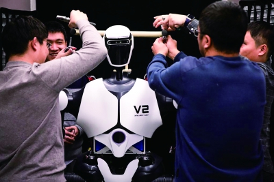 2024年1月31日,人形机器人攻关团队科研人员在多模态人工智能系统全国重点实验室调试机器人。