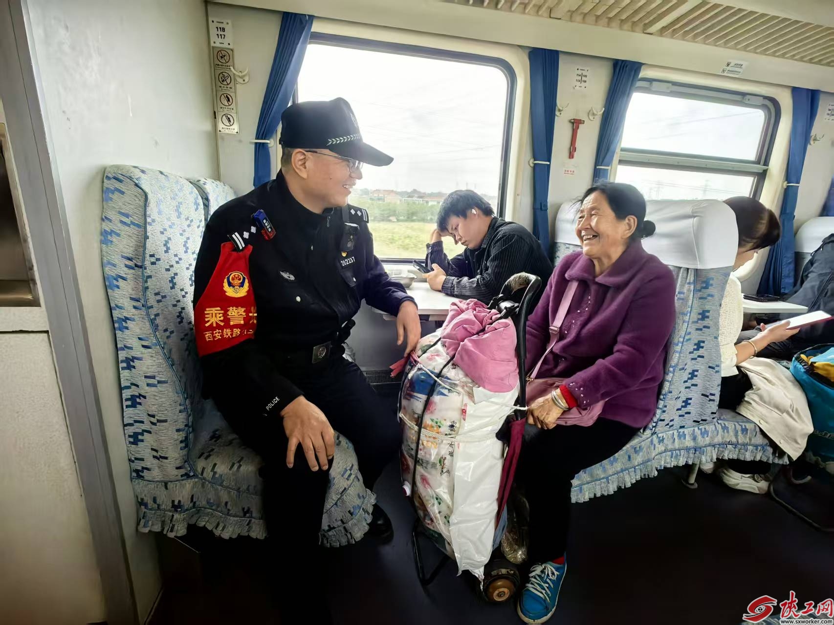 西安铁路公安处西安东站派出所范拴柱在列车上向沿途乘车老乡开展安全提醒。