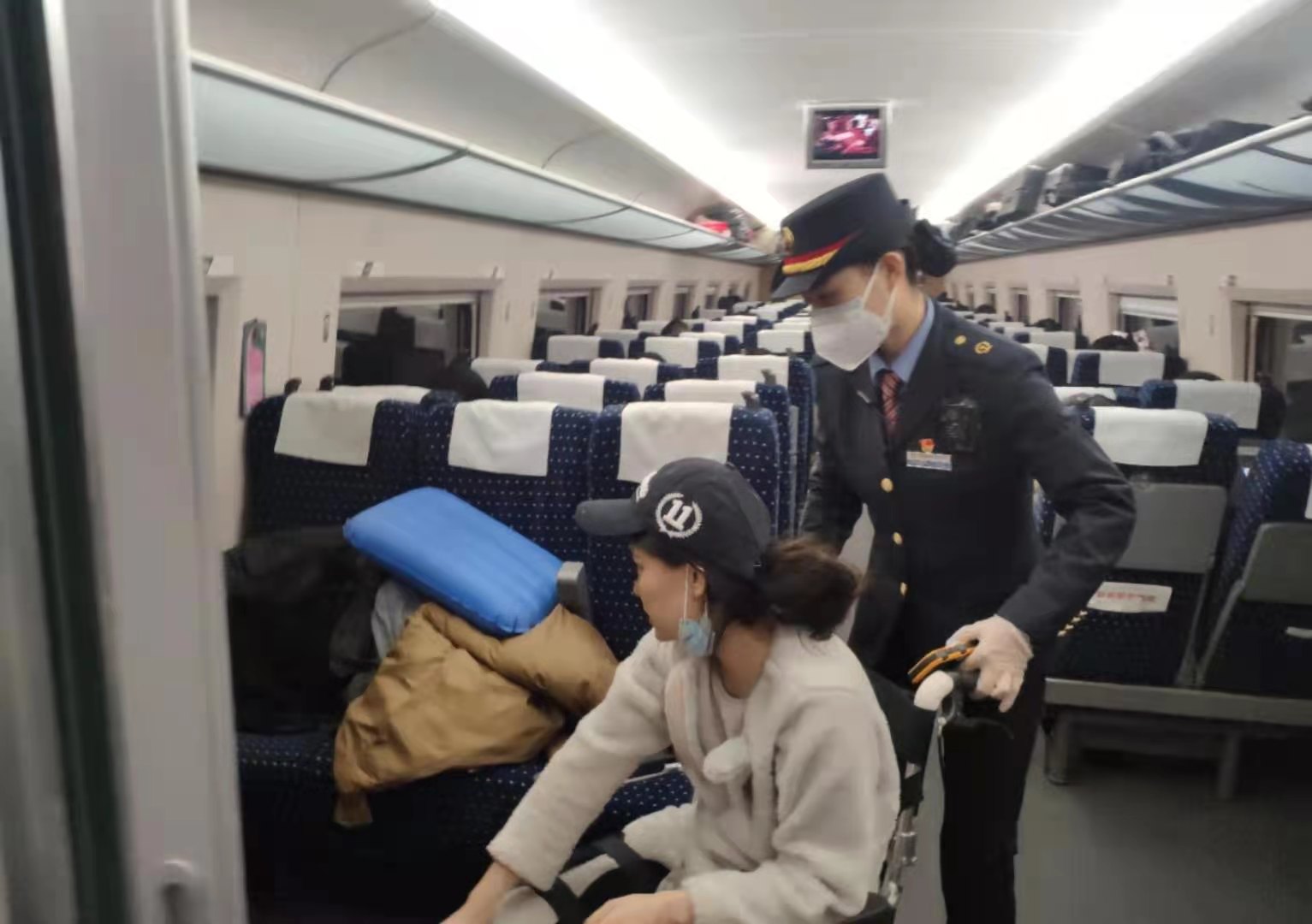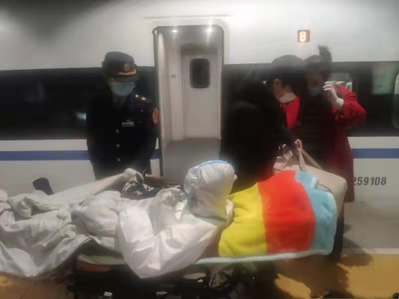 14:55分G658次到达郑州东站,班组安全员王伟在对讲机里听到工作人员呼叫列车长程静,8号车厢有位旅客需要交接。王伟听到后立即赶到8号车厢门口帮助两位旅客上车。了解后得知,王女士的女儿晶晶因腿部粉碎性骨折,需要去北京治疗,为节省往返路费,她独自一人推着轮椅带着14岁的女儿晶晶进京。列车长程静让王伟将王女士和受伤的女儿引导至9号餐车就坐,由于疫情期间餐车旅客少,方便轮椅放置和照顾孩子。途中列车长程静,安全员王伟细心服务,安抚鼓励小晶晶“别怕,一路有我们,你会没事的,到北京一定会看好腿,回来还坐我们的车”。并交代列车工作人员为晶晶送水补水清理杂物,时时询问晶晶情况。孩子母亲王女士感谢地说“如果没有你们的帮助,我都不知道怎么办才好”。