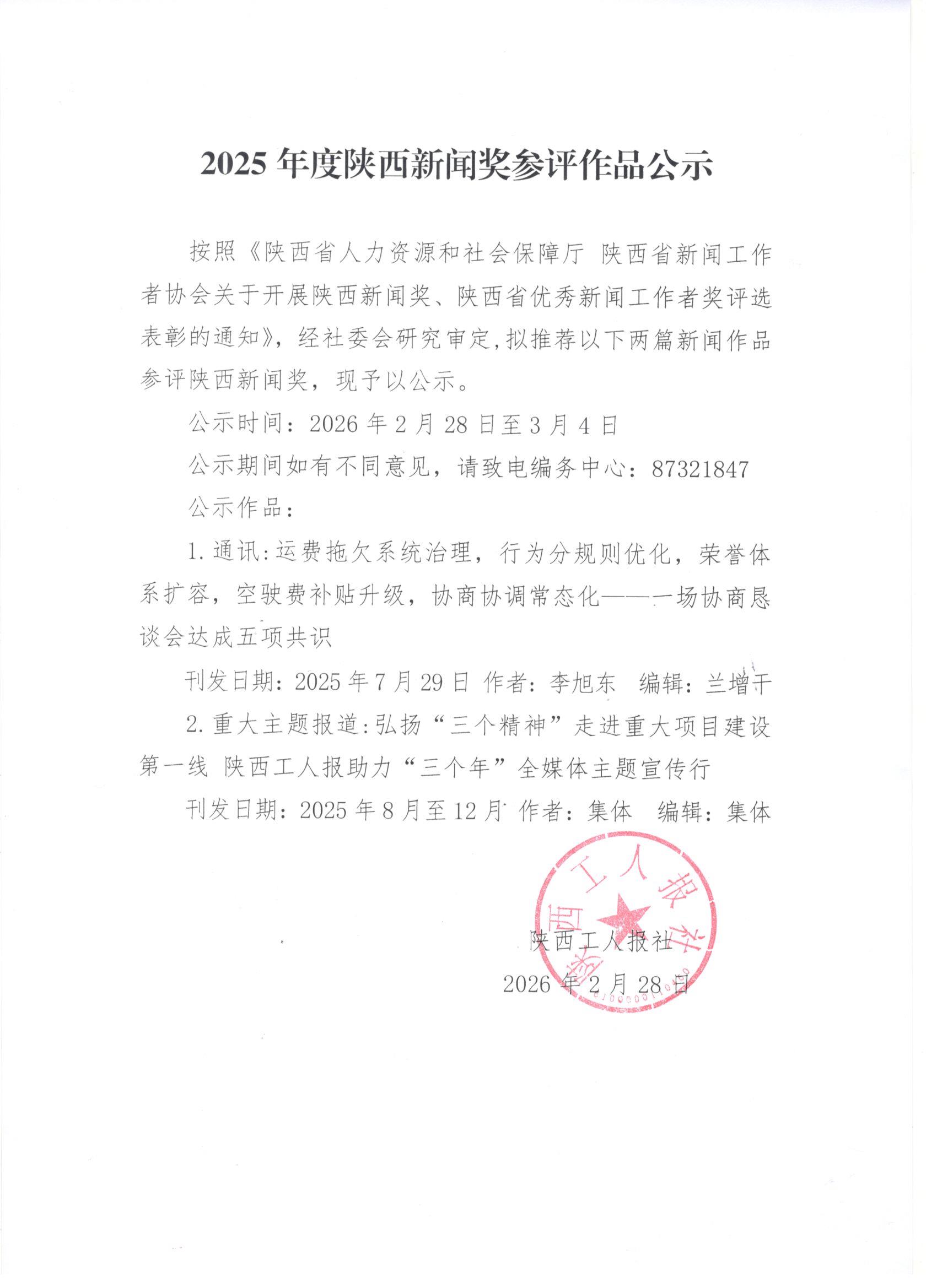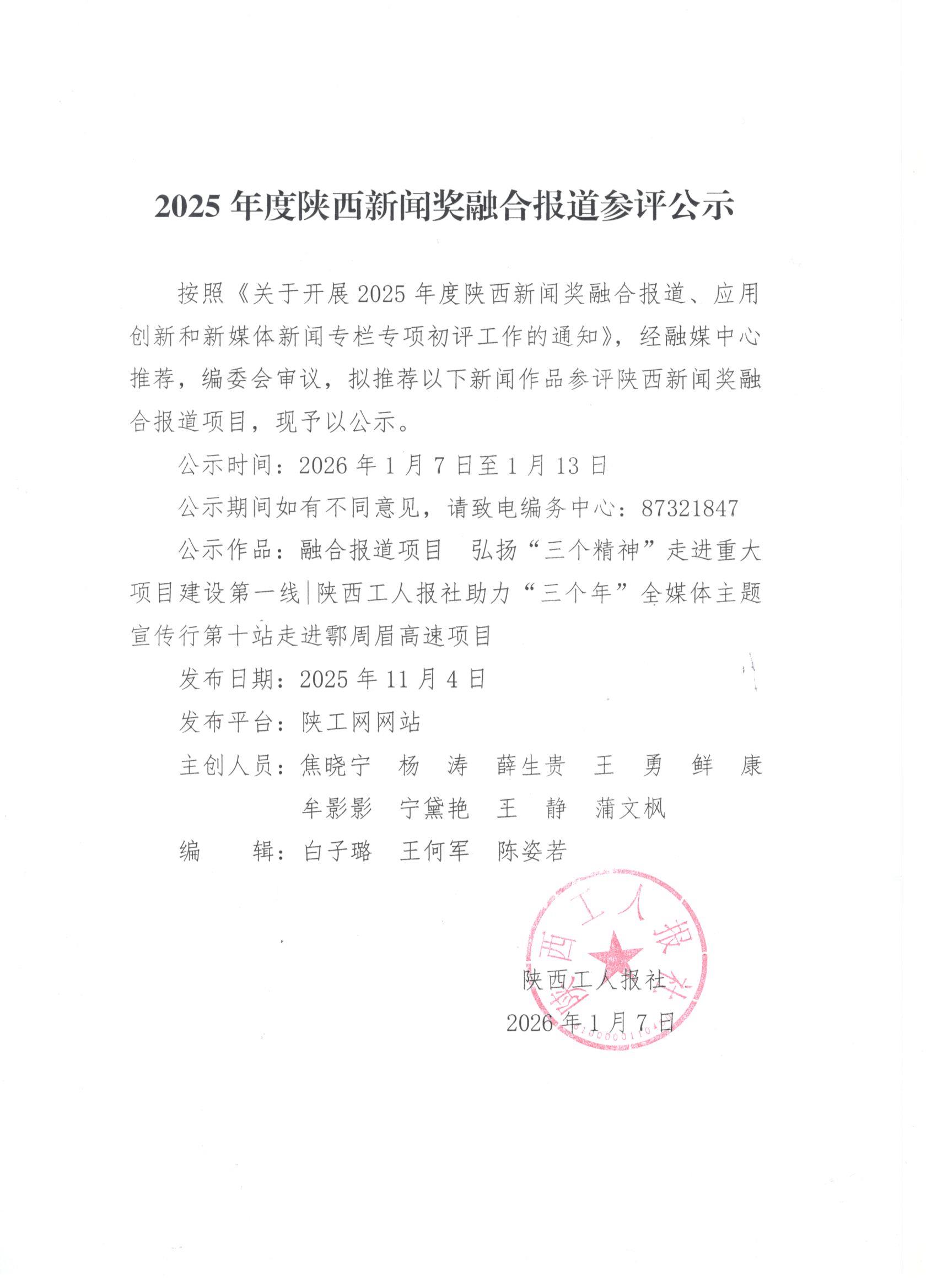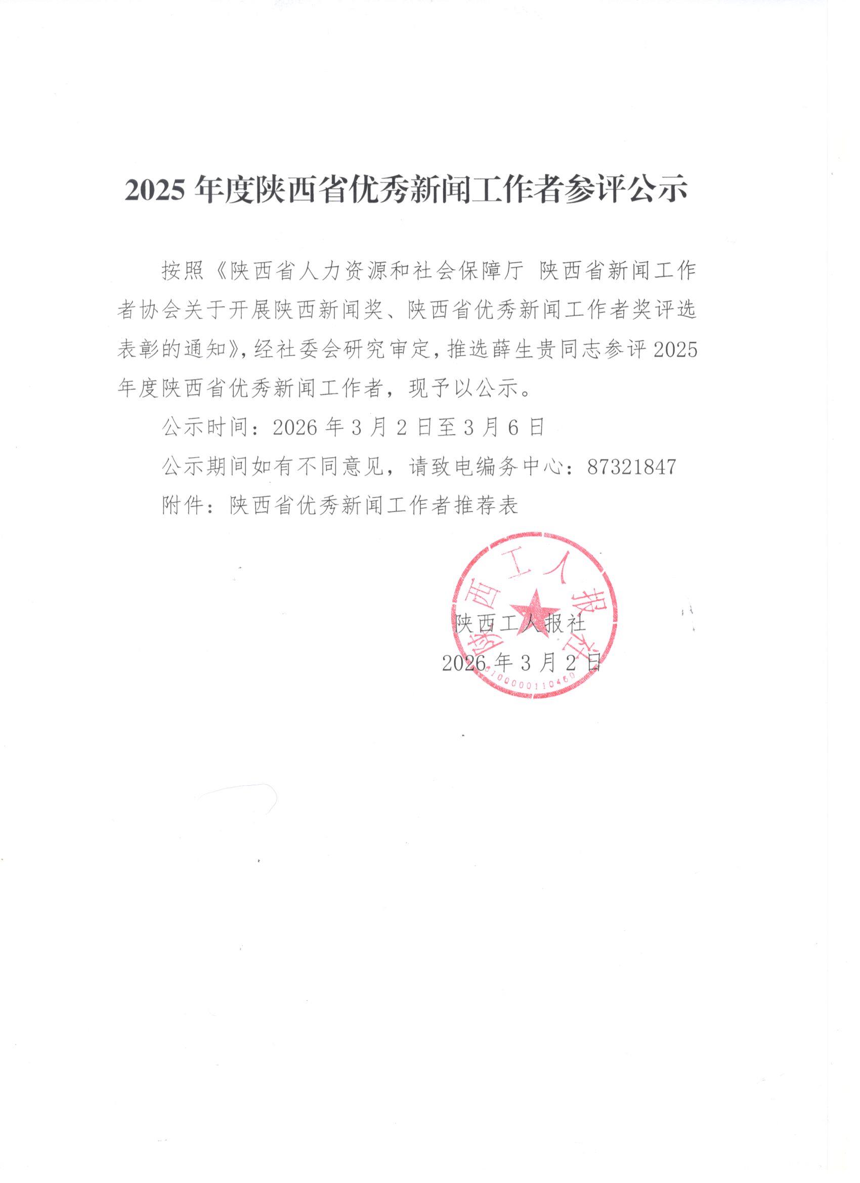 按照陕西省新闻工作者协会《关于2025年资深新闻工作者荣誉证书证章申报工作的通知》要求,陕西工人报社经过严格审核,拟对三人申报资深新闻工作者荣誉。现将人员具体情况进行公示。 公示时间:7月30日至8月2日