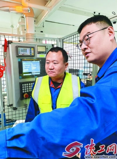 宋鹏(左)听师傅讲授机床保养流程。