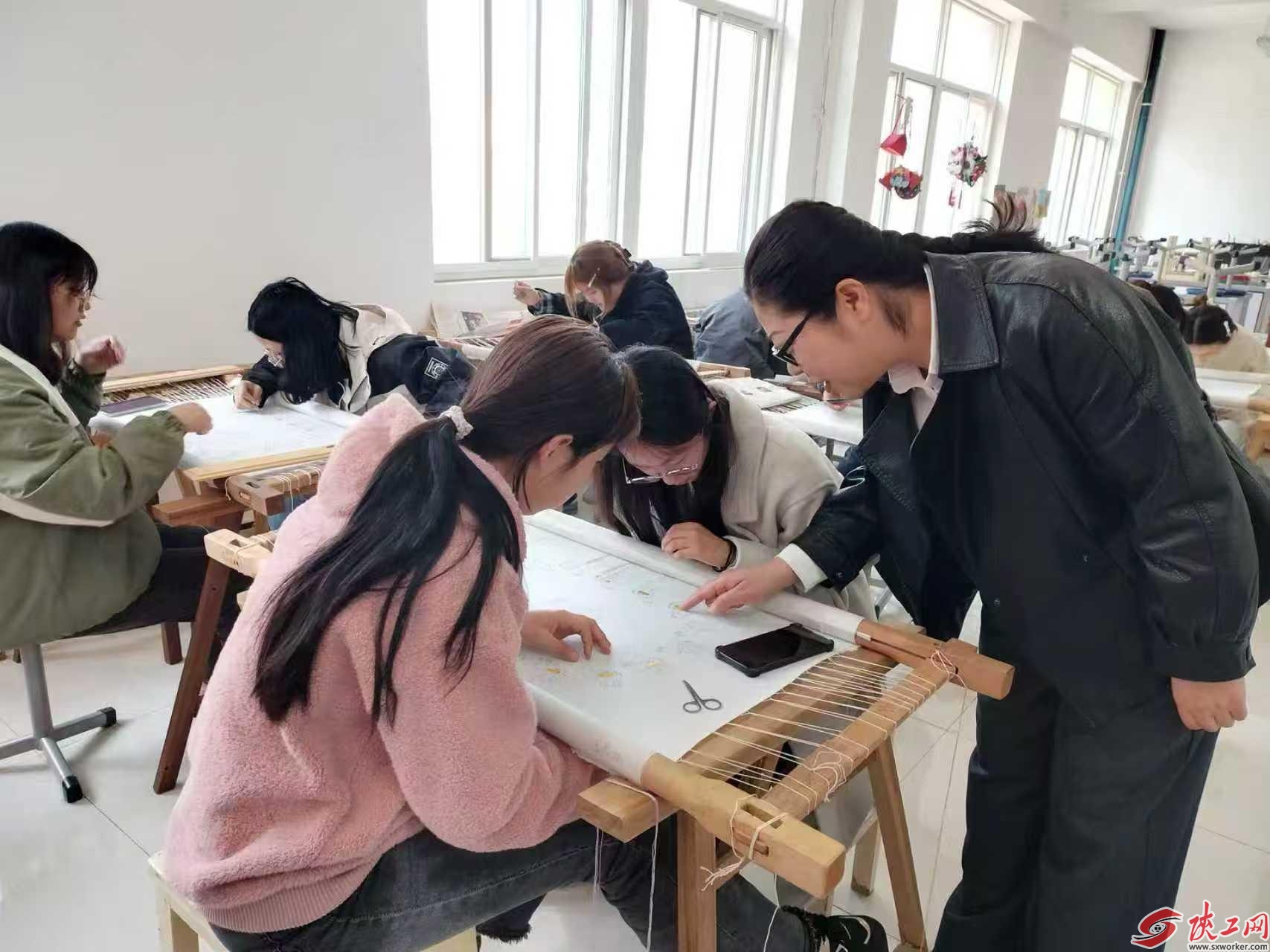 走进耀州区文化馆传习坊内,几十件秦绣作品错落陈列,针法细腻、气韵生动,尽显非遗技艺的独特魅力。作为新一代秦绣传承人,崔萌正与两名小学员围坐方桌,手持丝线、凝神运针,耐心讲解秦绣基础针法,指尖流转间,古老技艺在言传身教中焕发新生。