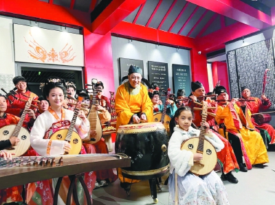 “咚咚,咚咚咚……”身穿汉唐古装、戴着垂脚幞头的鼓师扬槌起势,一阵有节奏的鼓点落下后,20余位乐手各就各位、紧密配合,笙管笛锣依次出场,将宫廷乐曲《郁金香》演绎得雍容典雅、大气磅礴。