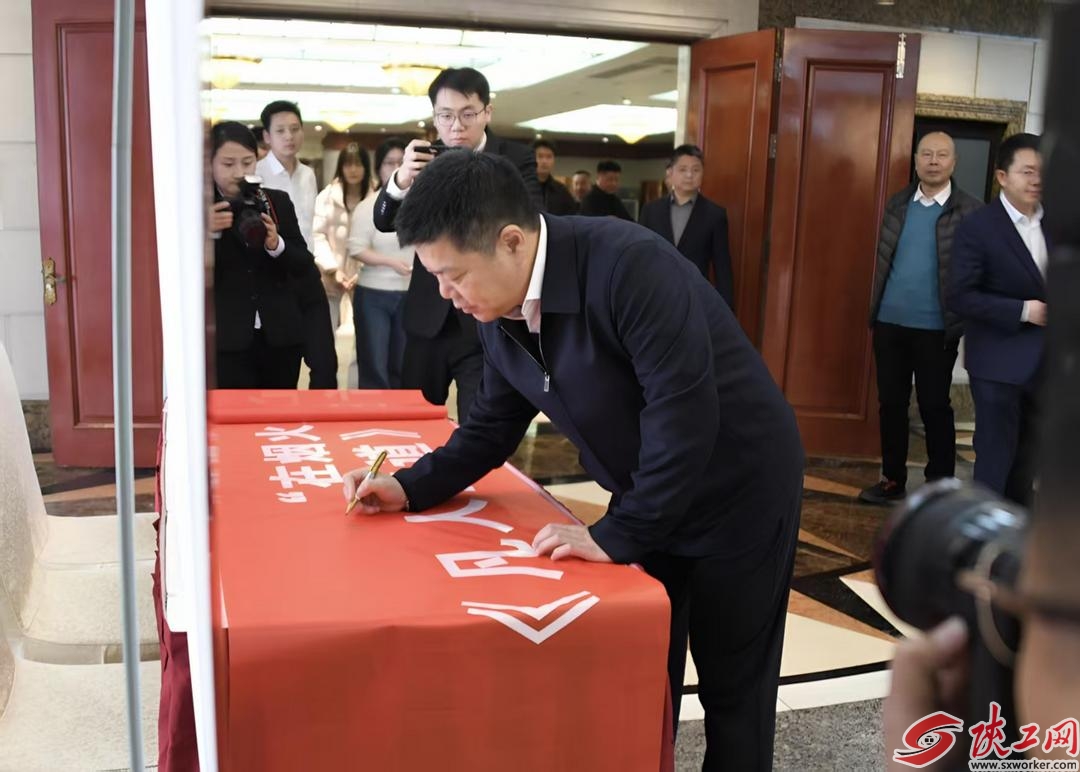 中铁一局党委书记、董事长郗宜君在新书发布横幅上签上自己的名字。