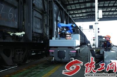 ⑤车站下行驼峰,工作人员进行智能提钩机器人调试。