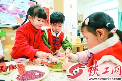 1月23日,在南京市雨花台区普德村幼儿园,小朋友挑选制作腊八粥的食材。