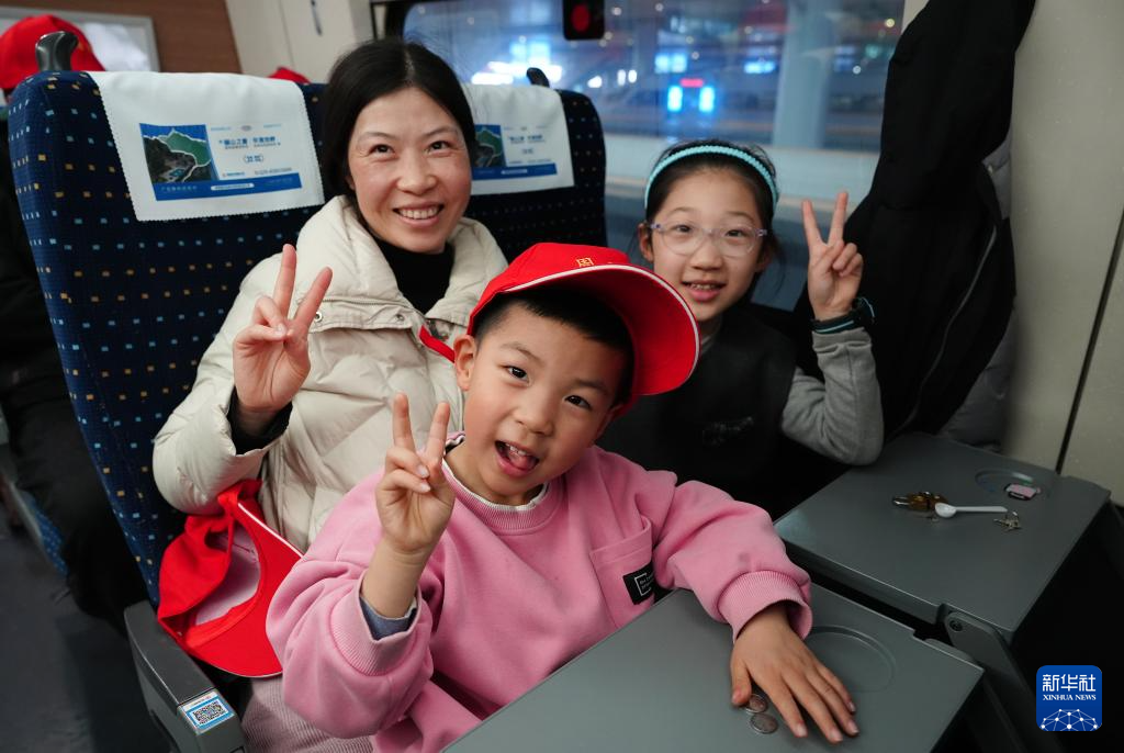 2月24日,来自西安市周至县的务工人员何淑利(左一)和女儿、儿子等待列车发车。新华社记者 邵瑞 摄