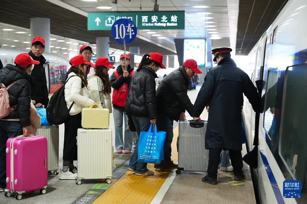 2月24日,来自西安市周至县的务工人员前往西安北站站台。新华社记者 邵瑞 摄
