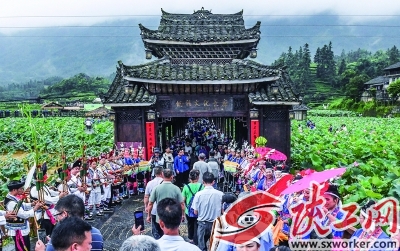 少数民族同胞在贵州省锦屏县隆里古城举办的“村晚”活动中展示花带。 杨文斌 摄