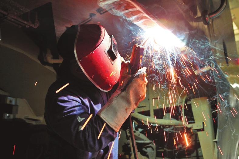 一束束耀眼的火花和“嗞、嗞”的声响引人注意。走近一看,“全副武装”的电焊工宋耀军正在为机车做焊接工作。手中的电弧光烘烤时产生的温度高达2000多摄氏度,为防止电焊时溅起的火花烫伤到皮肤,手套、工作帽、防护面罩、重达2斤的帆布防火服将宋师傅裹得严严实实。刺眼的强弧光,滚烫的焊渣,刺鼻的化学气味和粉尘,是宋师傅每天必须要承受的考验。炎热的夏季,高温更是给他带来了更多的困难,但高度的责任心,让宋师傅没有一刻懈怠。