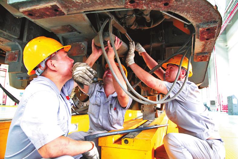 偌大的机车维修车间内,忙碌的工人们顾不上擦去脸上和身上的汗水,即使在三伏天,他们依然坚守在工作岗位上,承担、确保着西安、兰州、乌鲁木齐铁路局和青藏铁路公司配属的1400台和谐大功率货运机车C5及以上修程的检修任务顺利完成。