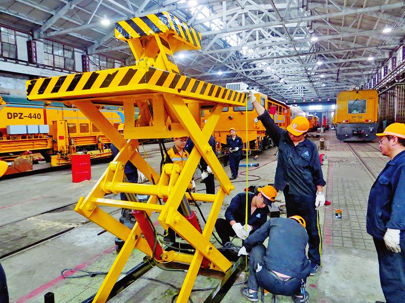 西安铁路局工务机械段以全国劳模蔡富平名字命名的“蔡富平劳模创新工作室”自成立以来,立足现场施工生产实际,围绕各项安全和技术难题,积极开展发明创造、小改小革和技术攻关活动,先后研发出了双塔并联式消防水罐、边坡清筛车降沉降污系统、铁鞋安全联锁装置等技术设备,为一线职工的工作安全和效率提供了坚实保障。图为“蔡富平劳模创新工作室”成员在对新研发的自轮运转设备检修作业地沟专用升降台进行调试试验。邵旭华 摄
