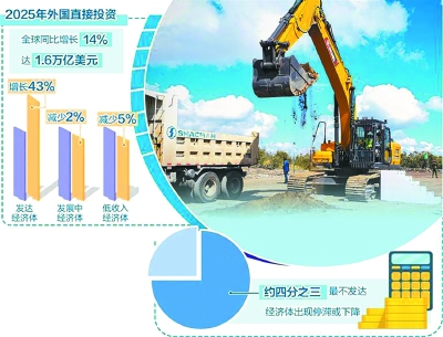 联合国贸易和发展会议(以下简称“贸发会议”)日前发布最新一期《全球投资趋势监测》报告指出,2025年全球外国直接投资(FDI)同比增长14%,达到1.6万亿美元,但增长主要是由于技术性反弹,并不意味着实体投资全面复苏。