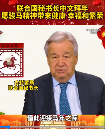 “春节快乐!”在中国常驻联合国代表团当晚举办的“骏启新程”新春庆祝活动上,古特雷斯在视频致辞中用中文向中国人民致以新春问候,并感谢中国和中国人民对多边主义和全球团结事业的大力支持。