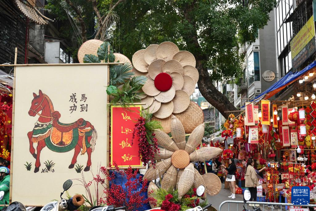 这是2月13日在越南首都河内的马市街拍摄的马年新春装饰。