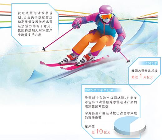 数据来源:《中国冰雪旅游发展报告(2026)》等 在米兰—科尔蒂纳冬奥会赛场周边,体育用品店货架上摆满了各类冰雪装备。拿起一根为滑雪运动新手准备的滑雪杖,“Made in China”几个英文单词引