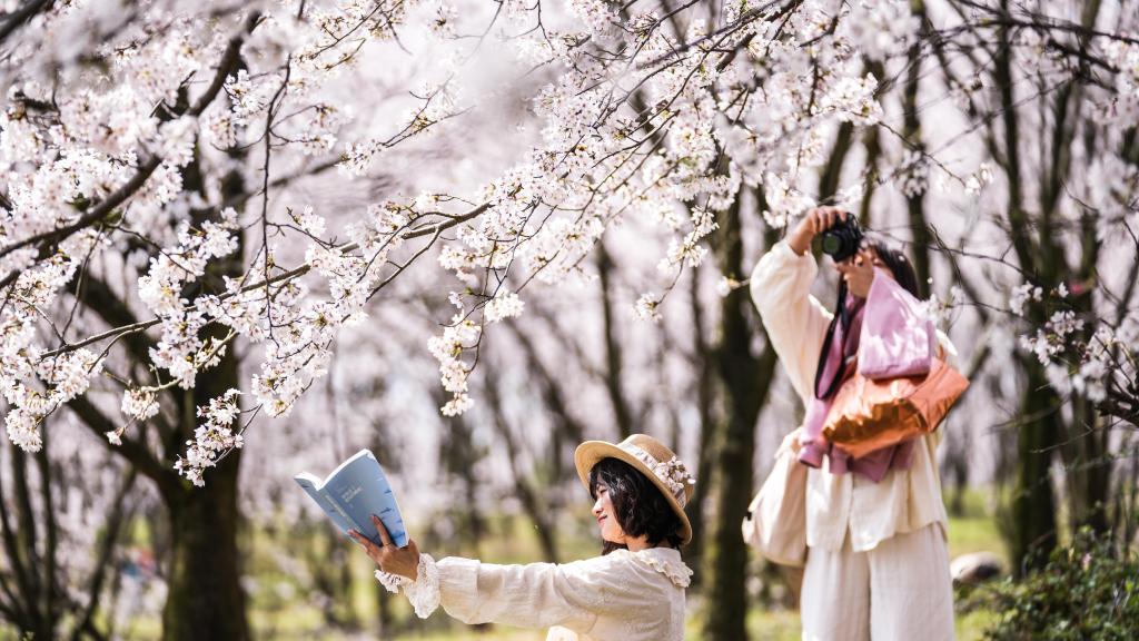 游客在贵州省贵安新区樱花园内拍照留念。新华社记者 陶亮 摄