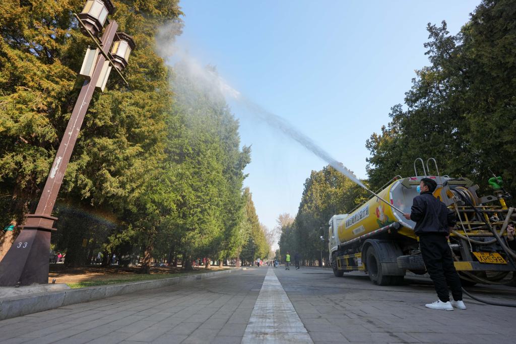 在北京地坛公园,工作人员使用添加了花粉固定剂的水对柏树进行喷淋。新华社记者 鞠焕宗 摄