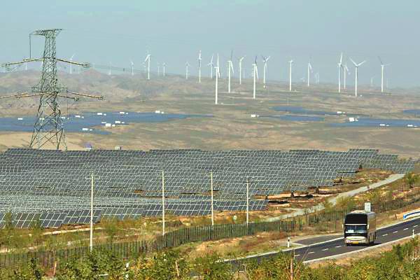 2015年年1010月月1010日日,,宁夏回族自治区宁夏回族自治区,,一处太阳能光伏产业园一处太阳能光伏产业园,,不远处是一座风电场不远处是一座风电场。