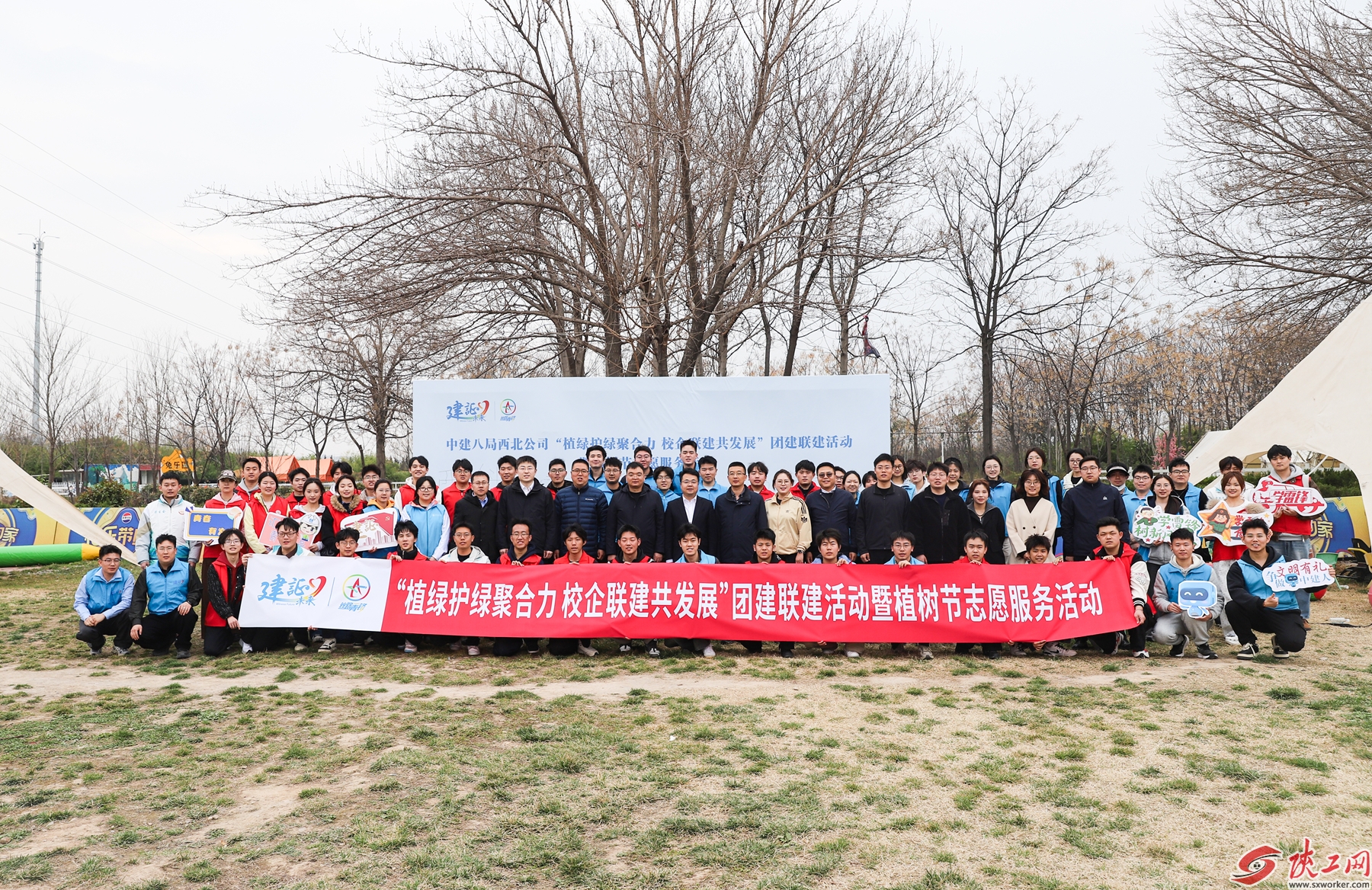 合影。 陕工网讯( 通讯员 刘逸华)阳春三月,绿意渐浓。3月12日第48个植树节当天,中建八局西北公司携手西安交通大学、长安大学、西安建筑科技大学、西安科技大学四所高校,开展“植绿护绿聚合力 校