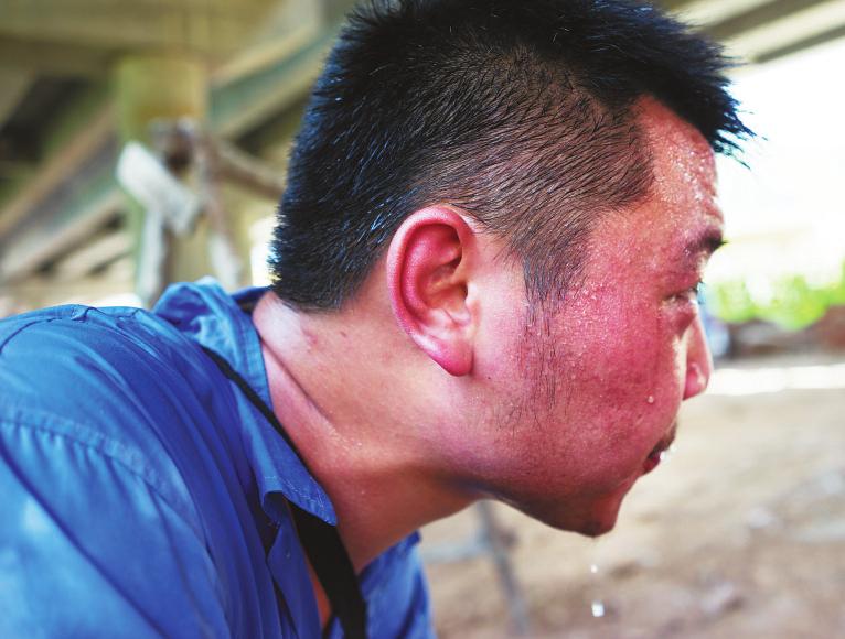 7月30日,在摄氏40度的高温下,商洛供电公司员工在30米高的铁塔上挥汗作业。