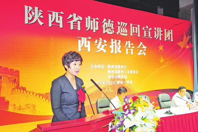 在随后举行的陕西省2015年师德宣讲首场报告暨西安报告会上,咸阳市渭城区风轮小学教师陈阿莉、西安市第83中学教师沙涛、延安市安塞县第二小学教师高彩云、商洛市柞水中学教师张霞和铜川市耀州区小丘镇白瓜中心小学教师王卫民先后作了感人的师德报告。