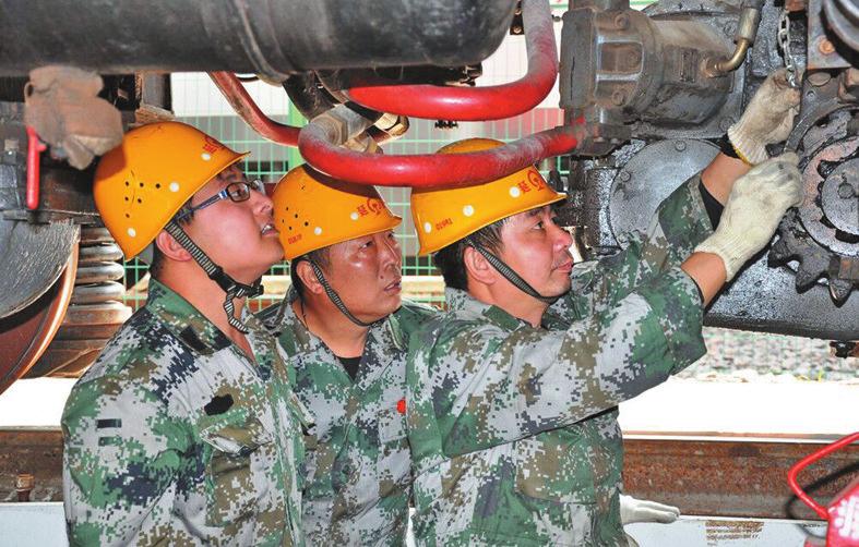 近日,西安铁路局延安机务段加强救援设备、机具日常保养和性能测试,确保救援设备质量稳定,达到随时救援出动的目的。图为这个段救援列车职工在认真检查起重机走行部。郜军山摄