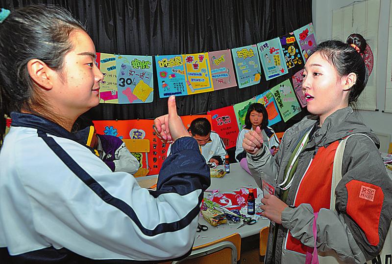 10月30日,由18名韩国聋哑人士组成的青年友好使者代表团来到陕西省城市经济学校,同该校特教师生交流、互动、联谊,并现场学习烙画、剪纸、陶艺等中国传统技艺。图为中国、韩国(右一)青年在用手语交流。