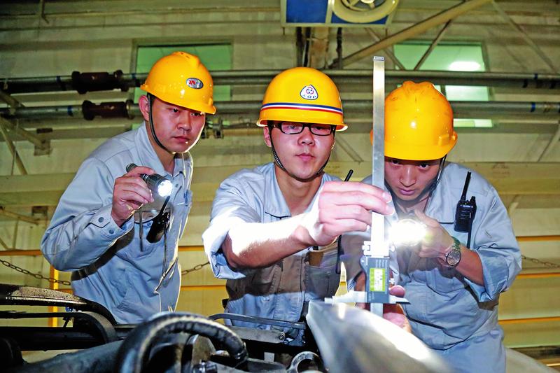 气温逐渐降低,西安铁路局西安动车段提前着手做好动车组设备防寒过冬准备,充分利用夜间动车下线入库检修时机,加强对车顶高压装置、绝缘子、受电弓等部件进行检查,让动车组能随时“温暖”上线安全运行,为旅客出行提供温暖舒适的运行保障。图为西安动车段检修车间运用修二组职工正在测量动车组受电弓碳滑板高度值。王曙天摄