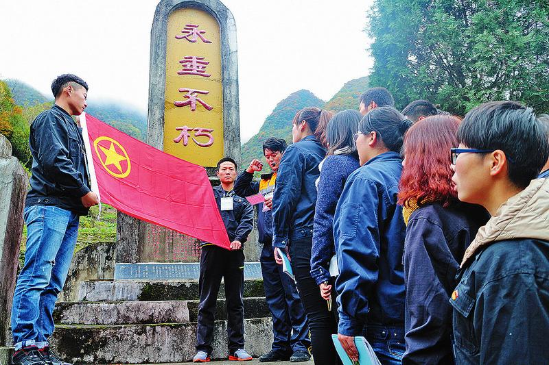 11月10日,西安工务段团委组织2015年新入路的大学生和高职生等60名青年职工代表赴“巴山精神发祥地”安康工务段巴山工务车间参观学习,通过了解和瞻仰巴山精神的历史、烈士陵园及巴山铁路人的工作和生活环境等,感受养路工的艰辛,激发他们爱岗敬业的热情。图为新工在巴山革命烈士陵园重温入团誓词。马小妹 摄