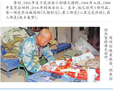 李剑,1965年生于武功县小村镇仄楞村,1984年入伍,1988年复员后回村,2006年到西安打工。至今,他已创作3部作品,第一部是参与编写的《仄楞村志》,第二部是《心里总是热的》,第三部是《故乡春梦》。写作环境虽艰苦,但李剑仍然坚持每天创作。