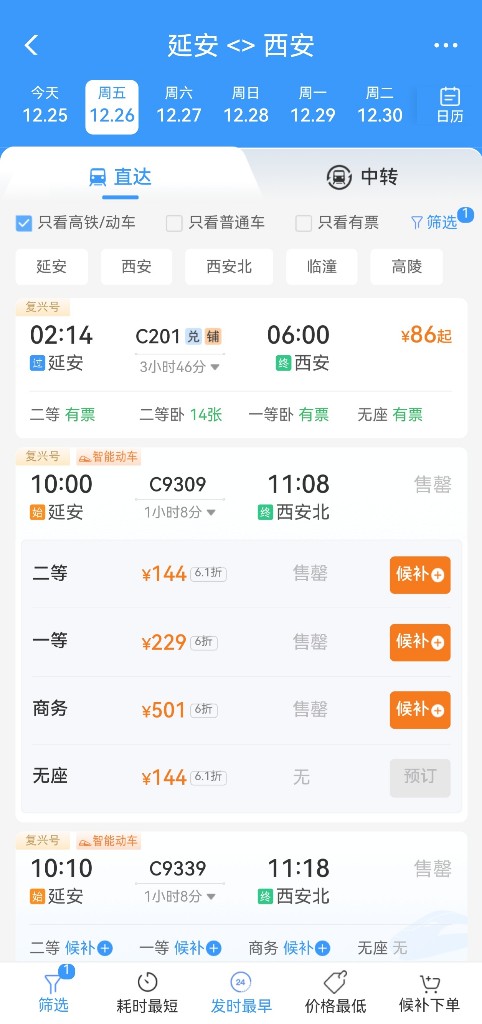 12月26日,西安至延安高铁将正式开通运营,根据中国铁路12306网站显示,C9312、C9309两趟首发列车将于上午10时分别从西安北站、延安站同步始发。