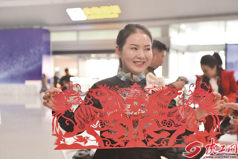 一张红纸托在手心、一把剪刀游走其间。不多时,只见一幅剪纸作品呈现眼前——两匹骏马一左一右回望宝塔山,中间则是钟楼嵌着“西安”二字。12月24日,在西安北站候车大厅,陕西省工艺美术大师陈莲莲正以安塞剪纸这一非遗技艺,向往来游客推介“坐着高铁‘回延安’”。