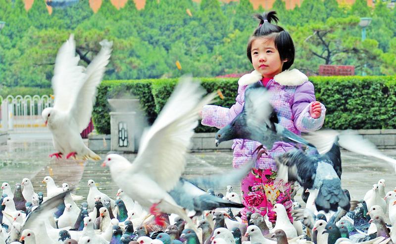 冬日里,西安市新城广场的和平鸽成了城市里一道靓丽的风景线,11月24日,记者在新城广场看到许多小朋友都在高兴地喂着鸽子。退休工人陈女士介绍,她经常带
