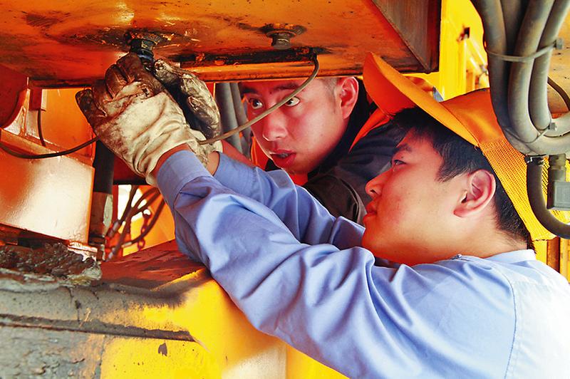 连日来,西安工务机械段扎实做好设备检修工作,组织党员骨干带头对设备“疑难杂症”进行排查处理,确保设备运行安全放心。 图为该段党员对大型养路机