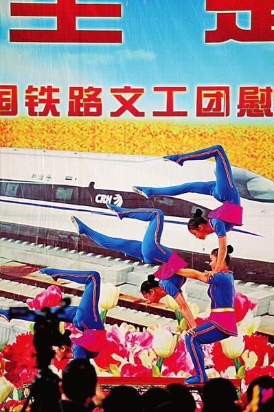 10月9日,中铁文工团来到西安东车辆段举行“新丰镇站区慰问演出”活动,奉献了杂技、相声、歌唱、舞蹈等14个节目,来自新丰站区6个单位500余名干部职工观