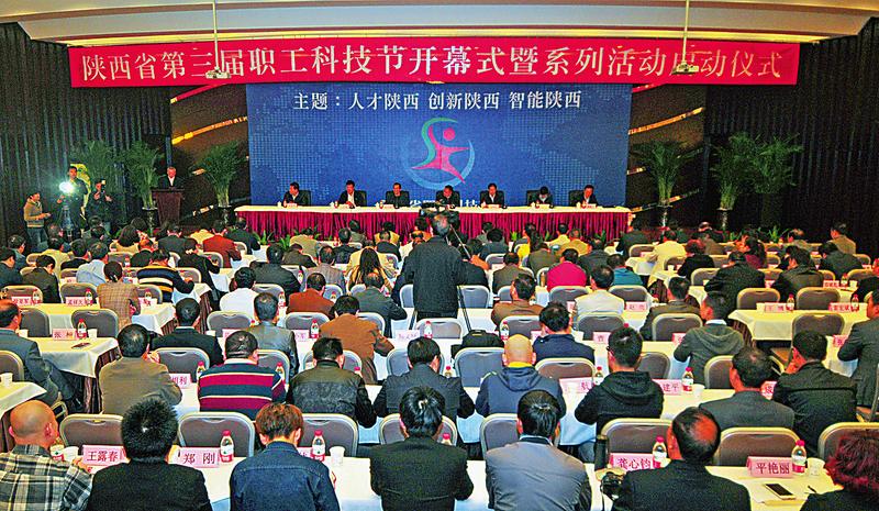 13日上午,陕西省第三届职工科技节启动。见习记者刘强摄 全总经济技术部部长、中国职工技术协会秘书长粟斌,省总工会常务副主席周树红等参观科技