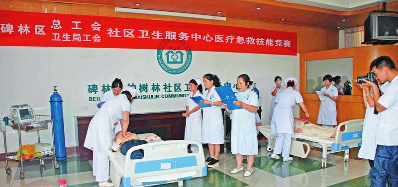 9月25日,西安市碑林区总工会、碑林区卫生局工会共同组织举办了“碑林区2015年社区卫生急救实操技能大赛”。图为竞赛现场。本报记者 王何军 通讯员 李君