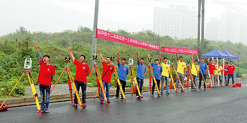中铁十二局一公司工会采取建书屋、组织知识竞赛、搭建比武平台等形式,快速提升职工专业技术素质,为企业培养了大批急需的技术人才。图为测量工在雨中进行