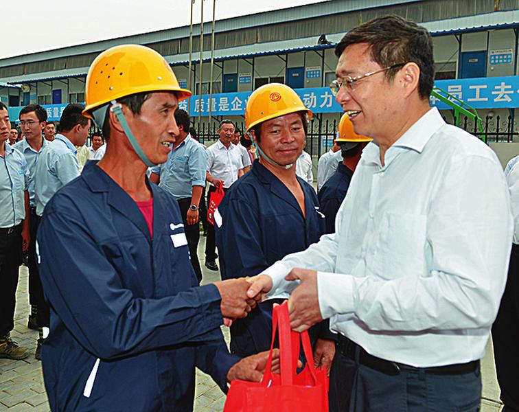 省总工会党组书记、主席白阿莹(右一)慰问农民工会员(图1)。 本报记者郭玉军 摄 省委副书记胡和平(左一),省总工会党组书记、主席白阿莹(左
