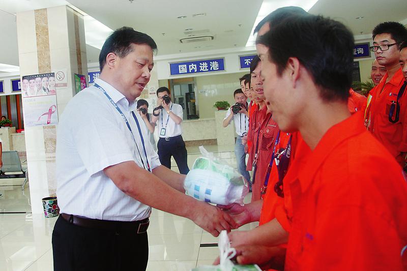 8月3日,省总工会副主席丁立虎一行赴东方航空公司西北分公司看望慰问一线职工,并送去防暑降温用品。 见习记者刘强摄