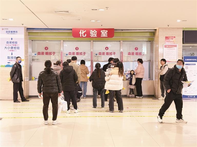 患儿家长在西安市儿童医院化验窗口排队。 近日,随着流感进入高发阶段,西安市儿童医院、长安区医院、西北妇女儿童医院曲江院区等多家医疗机构的就诊量增加。各医院迅速启动应急响应,延长门诊时间、优化就诊
